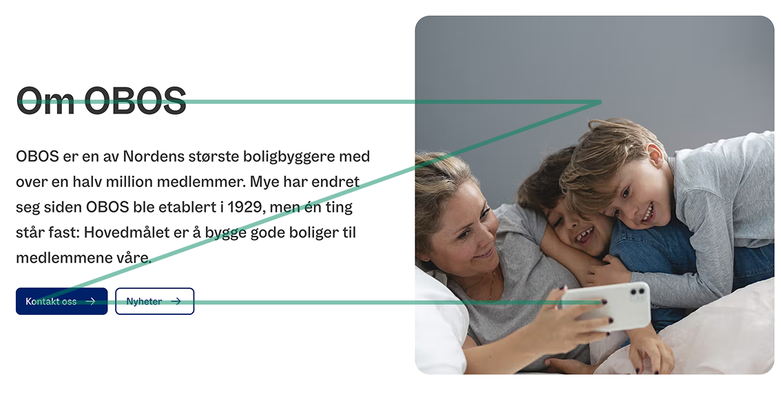 Negativ plass hjelper brukerne med å fokusere på bestemte elementer eller deler av en nettside eller et program. Når vi i OBOS har nok plass rundt viktig innhold, kan vi rette brukernes øyne mot nøkkelinformasjonen eller handlingsfremmende knapper, og dette hjelper dem med å sørge for at brukerne raskt og uanstrengt kan oppdage og engasjere seg i de viktigste elementene på siden. Siden de er oppmerksomme, kan brukerenes øye oppnå mye mer.