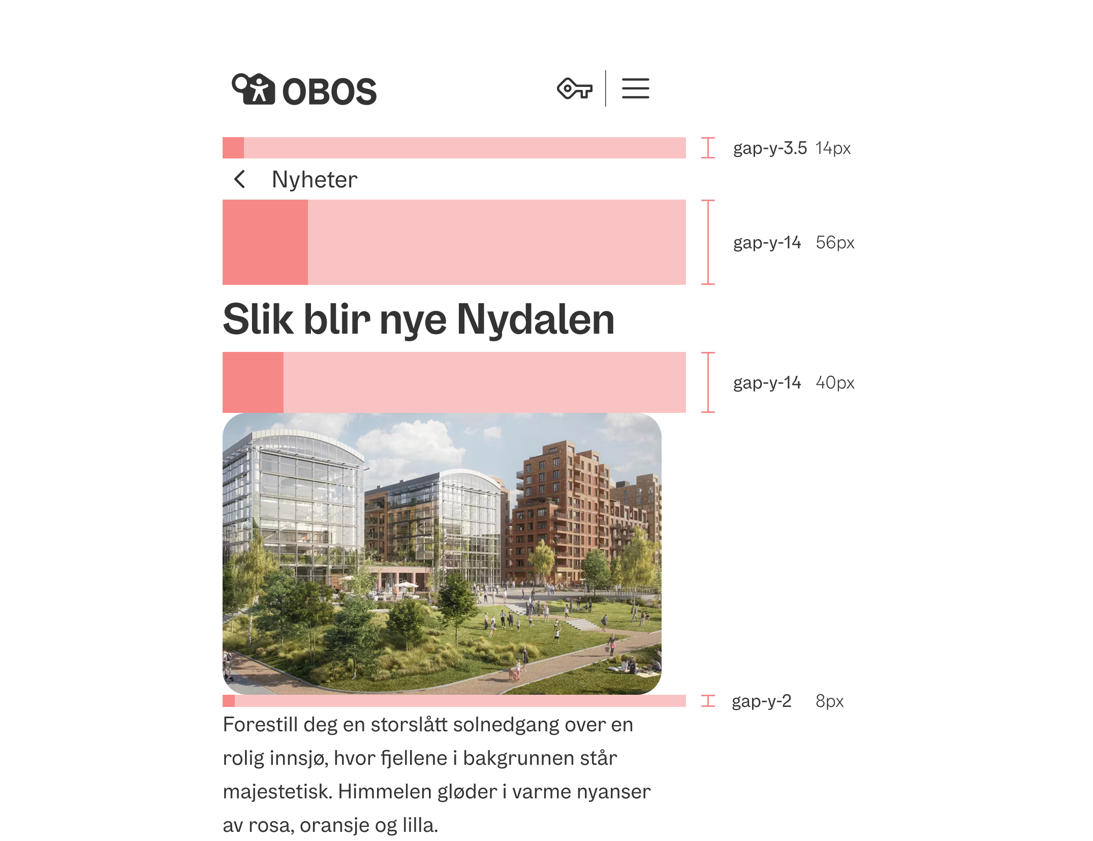 Grunnmuren bruker Tailwind sine variabler som base. Den tar med seg både små justeringer for å få til riktig luft i designet, og større justeringer for å styre tettheten i designet. Hver avstand på skalaen har sin egen syntax. Du kan bruke avstandene både inne i komponenter for bygging og mellom dem for layout.